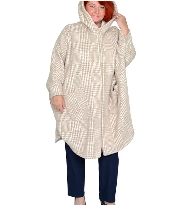 Пончо с карманами, на молнии, с капюшоном из плотного теплого трикотажного полотна «травка». Состав акрил 95% и эластан 5%. Ткань очень приятная, мягкая, теплая, не мнется. Длина 100-120 см.