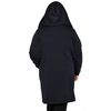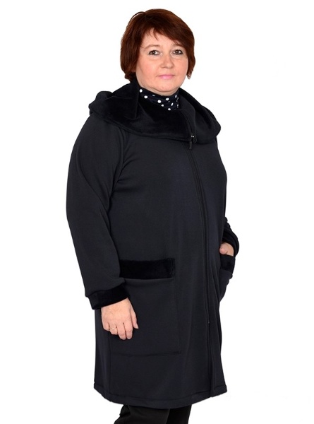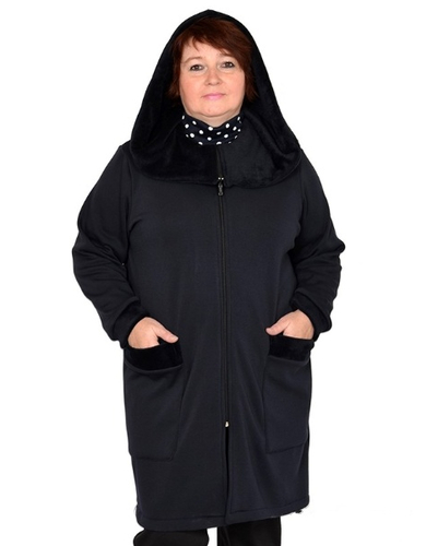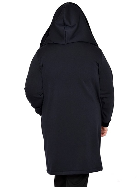 Кардиган из трикотажного двухстороннего полотна. Снаружи трикотаж гладкий, изнутри ворсистый. С объемным капюшоном, с накладными карманами, застежка на молнию. Без подкладки. Капюшон можно использовать как объемный воротник. 40% вискоза, 55% полиэстер и 5% эластан. Длина 90-95 см.