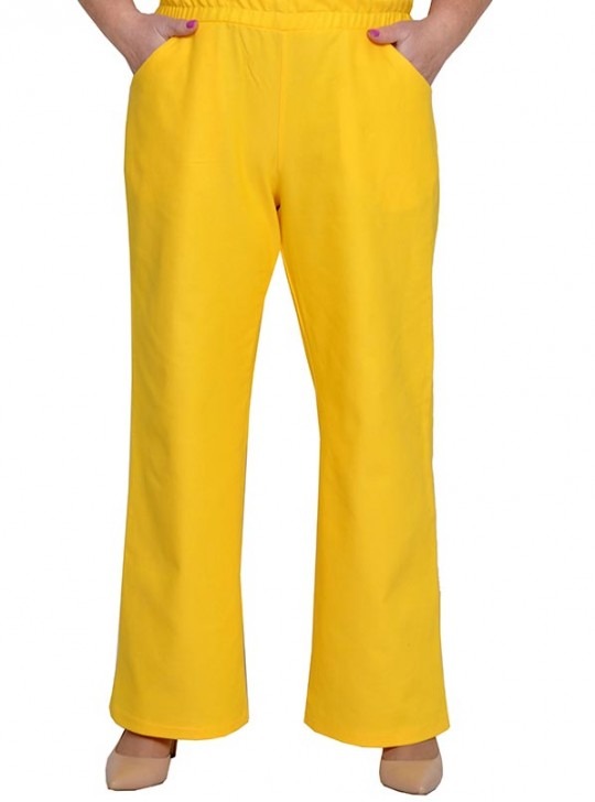 Брюки расклешенные с карманами из плотной джинсовой ткани. Состав 65% хлопок, 35% пэ. Пояс на широкой резинке.