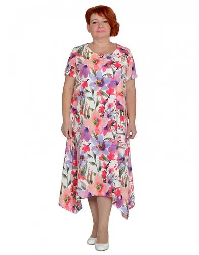 Платье с фигурной линией низа. Ткань немного тянется. Состав вискоза 65% и 35% пэ.