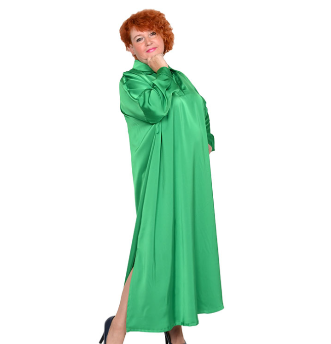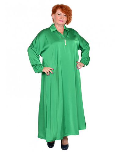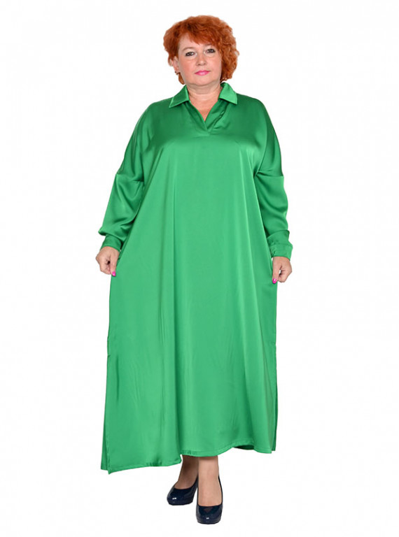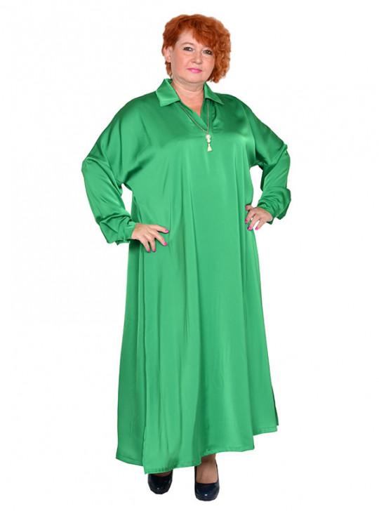 Платье в стиле бохо из шелка-атласа. Состав 100% пэ. Модель с V-образным вырезом, с воротником, рукава с манжетами на кнопках.