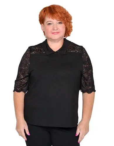 Блуза из трикотажного полотна вискоза с отделкой эластичным кружевом. Состав 100% вискоза. Модель с воротником, кокетка по переду и спинке из кружевного трикотажного полотна. Длина 75-90 см.
