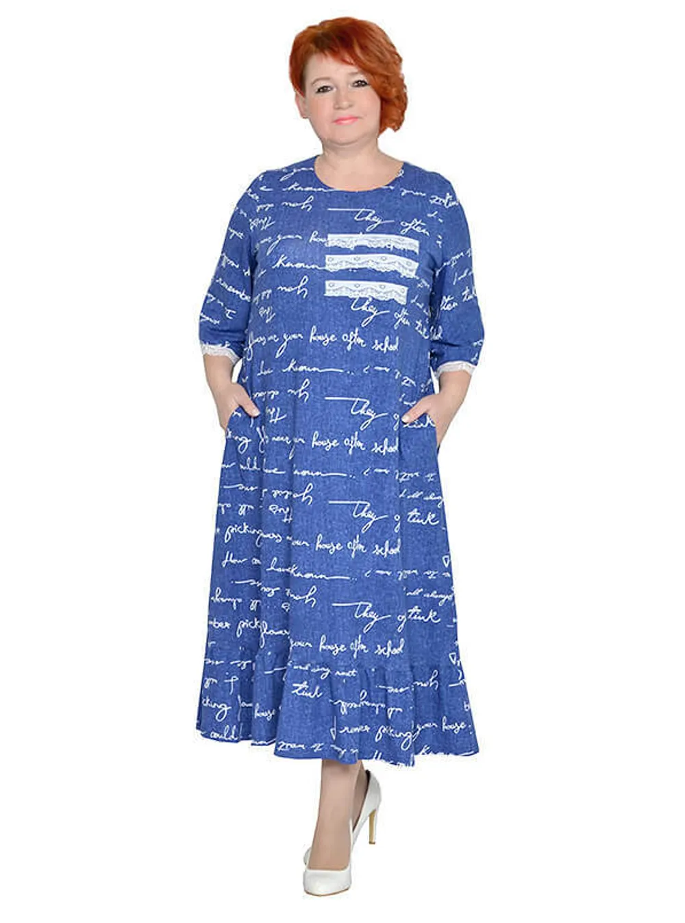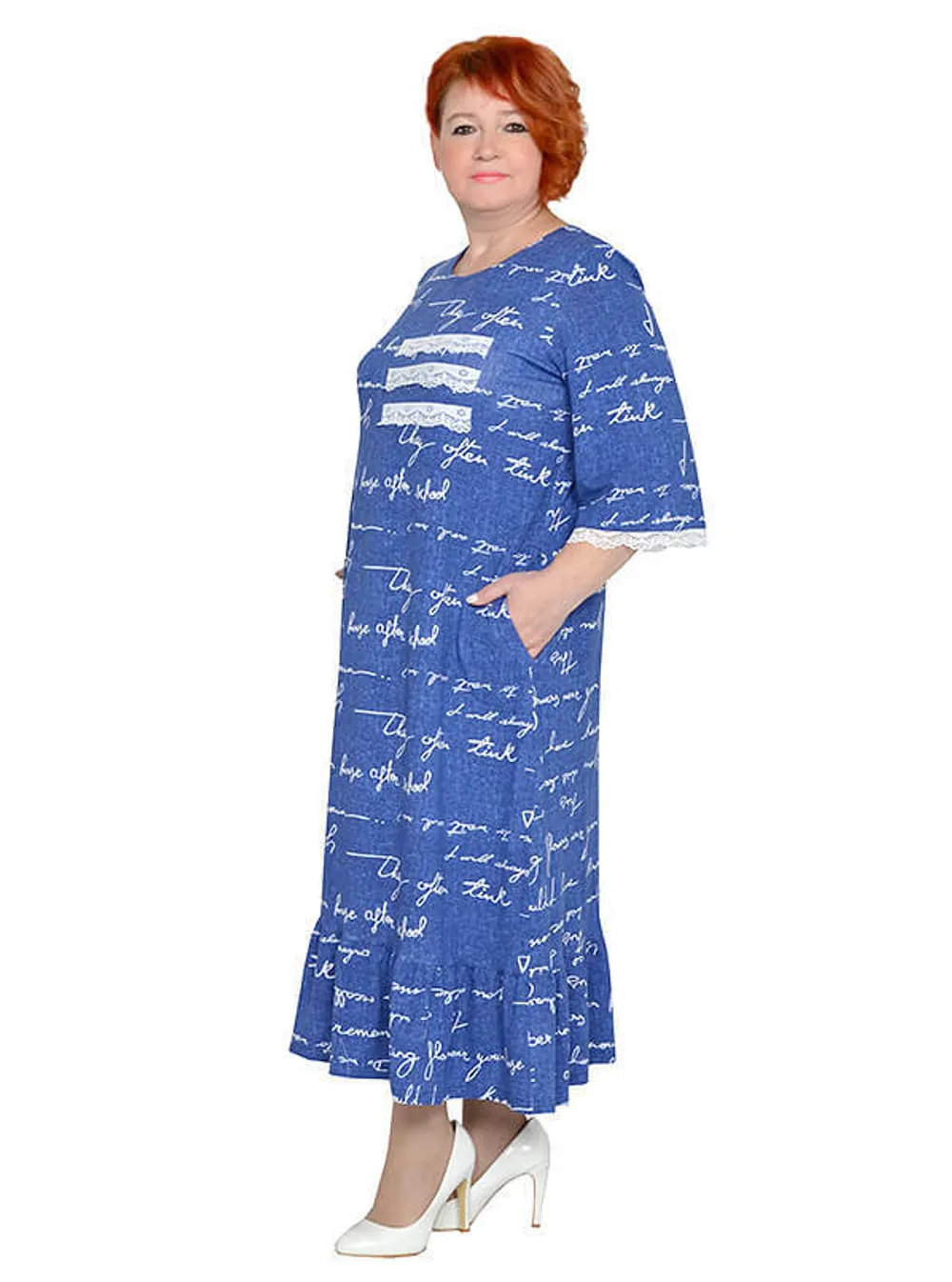 Платье из трикотажного полотна вискоза. По рукаву и спереди отделка трикотажным кружевом, по низу оборка.