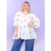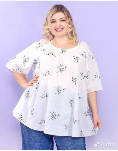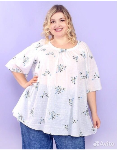 Лёгкая туника из тонкого хлопка. Ткань расшита голубыми цветочками. Фасон сильно расклешен. Вырез горловины посажен на резинку. Блуза прекрасно подходит для летней погоды. В ней Вам будет легко и комфортно. Длина около 80 см. Состав ткани: 100% хлопок.