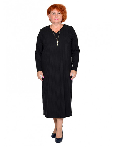 Платье с V-образным вырезом из трикотажного полотна «лапша». Состав 35% вискоза, 60% пэ, 5% эластан. Длина 115-125 см.