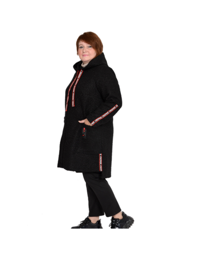 Куртка-Пальто. Модель с карманами, застежка молния, с капюшоном, без подкладки, на груди вытачки. Ткань -барашек, состав пэ, тянется умеренно, очень теплая и легкая, не мнется. С декоративной отделкой на кармане-компас и декоративной тесьмой по рукаву, боковому шву. Завязки у капюшона также декоративная тесьма. Спинка у модели чуть длиннее полочки. Сезон весна-осень.
