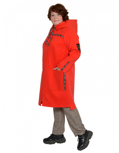 Пальто. Модель с карманами, застежка молния , с капюшоном, без подкладки , на груди вытачки, с декоративной отделкой на карманах, кокетке, на рукаве декоративный элемент. Завязки у капюшона также декоративная тесьма. Спинка у модели чуть длиннее полочки. Сезон весна-осень.