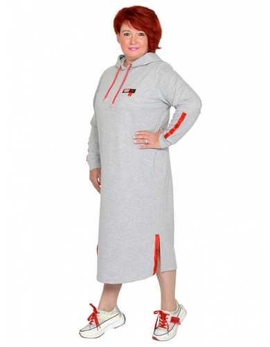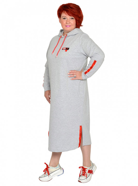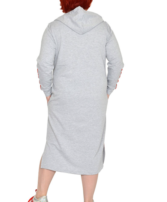 Платье с карманами, с капюшоном, с разрезами из трикотажного полотна футер двух-нитка. Состав хлопок 65%, пэ 30% и эластан 5%. На рукаве, по переднему краю разреза декоративная лента.