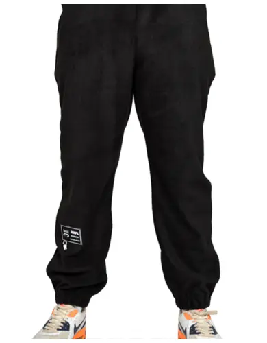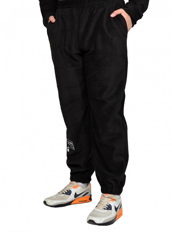Брюки из трикотажного полотна флис с декоративным элементом. Состав 100% пэ. Модель с карманами, пояс на широкой резинке.