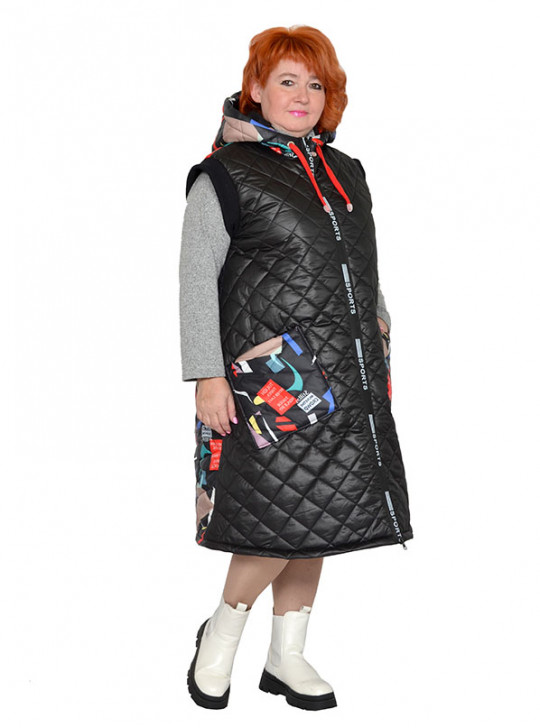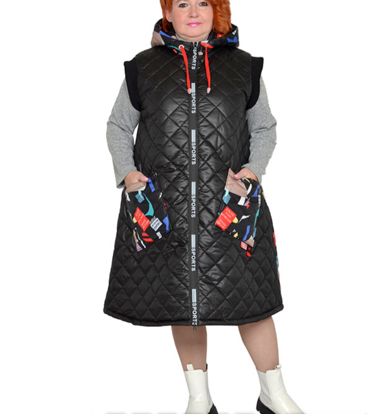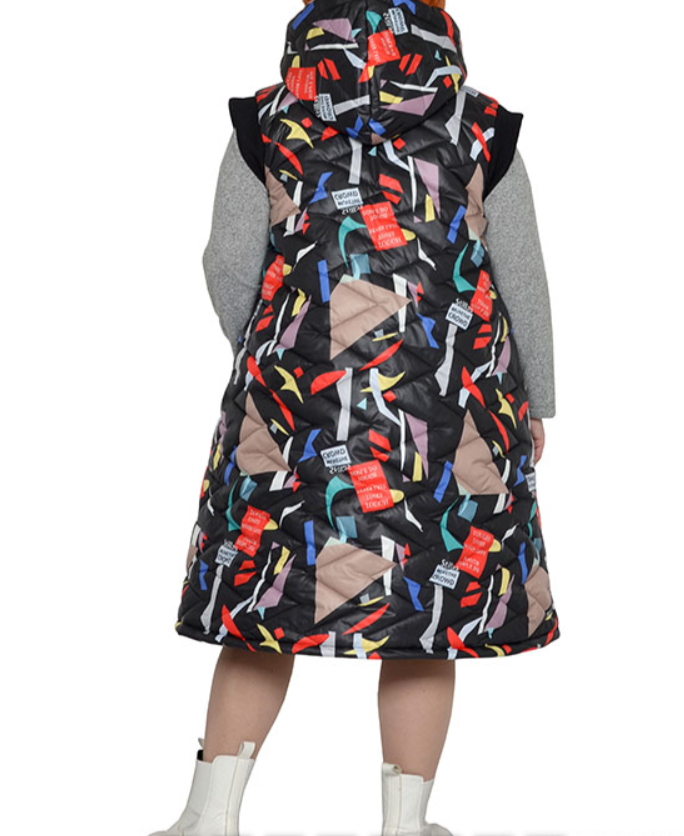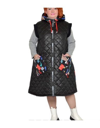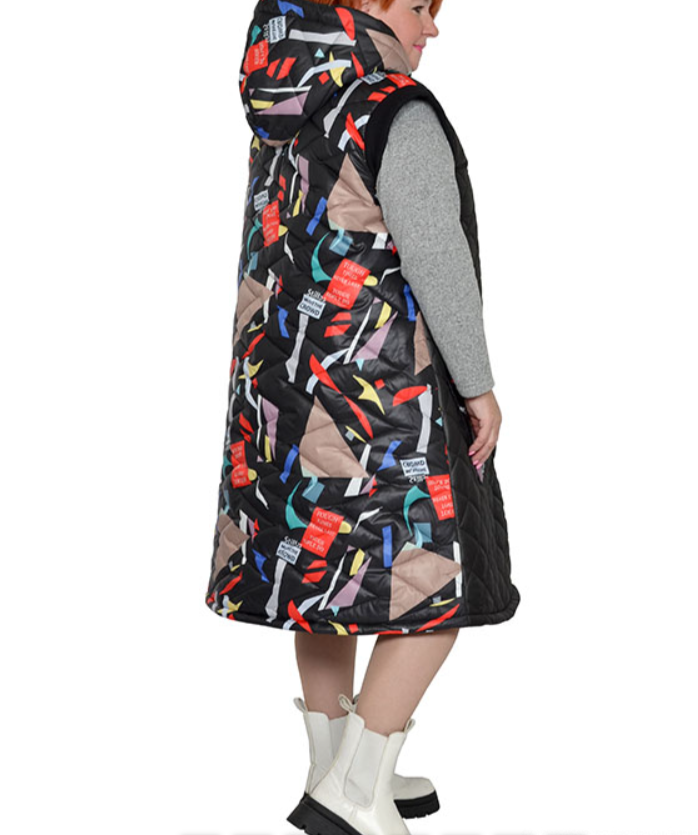 Жилет расклешенный с капюшоном из болония стеганного на синтепоне с хлопковой подкладкой. Модель выполнена из тканей компаньонов с карманами, застежка декоративная молния. Состав верха 100% пэ. Длина 105-120 см.