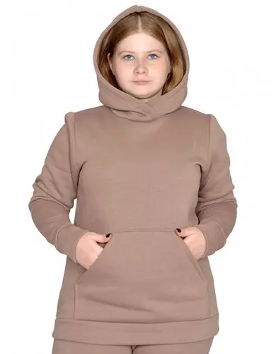 Толстовка из трикотажного полотна футер 3х нитка с капюшоном. Состав 65% хлопок, 5% эластан и 30 % пэ. Ткань мягкая, плотная, не мнется, теплая.