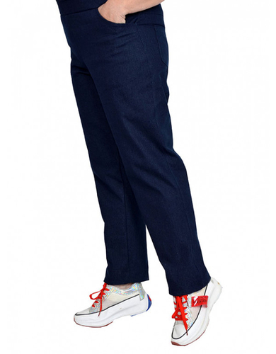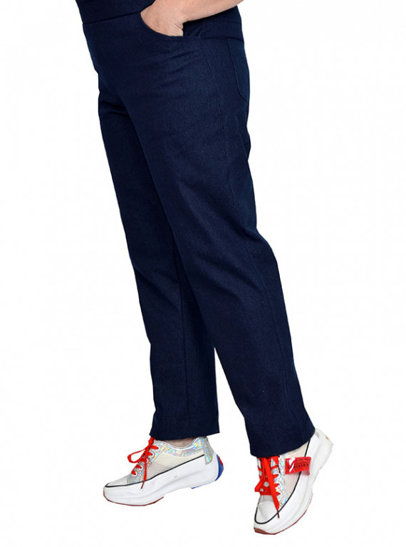 Брюки, пояс на широкой резинке, с карманами. Ткань джинс, тянется умеренно. Состав 60% хлопок, пэ 38% и 2% эластан.