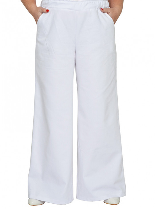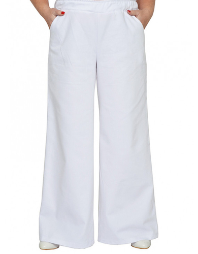 Брюки широкие из джинсовой ткани с карманами, пояс на широкой резинке. Состав 65% хлопок, 35% пэ. Ткань имеет хорошее растяжение.