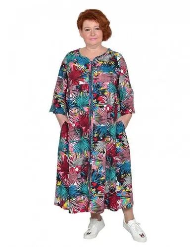 Халат расклешенный из трикотажного полотна. Состав 100% хлопок. В боковых швах карманы.
