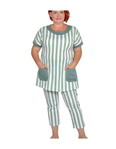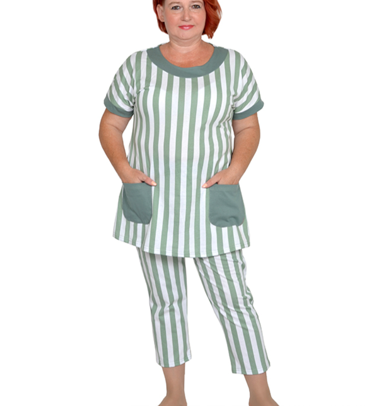 Туника из трикотажного полотна с карманами и отделкой по горловине из ткани компаньона. Состав 98% хлопок и 2% эластан.