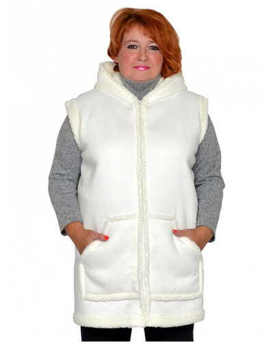Жилет из искусственной двухсторонней замши, с карманами, с капюшоном, застежка молния. Ткань хорошо тянется, теплая, приятная к телу, мягкая. Состав пэ 95%, эластан 5%. Модель без подкладки, изнанка- барашек, лицевая сторона-искусственная замша. Длина 85-100 см.