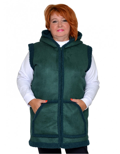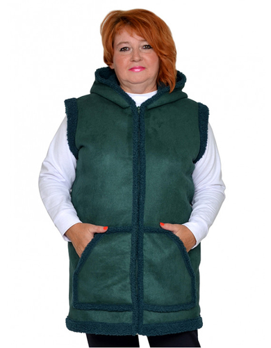 Жилет из искусственной двухсторонней замши, с карманами, с капюшоном, застежка молния. Ткань хорошо тянется, теплая, приятная к телу, мягкая. Состав пэ 95%, эластан 5%. Модель без подкладки, изнанка- барашек, лицевая сторона-искусственная замша. Длина 85-100 см.