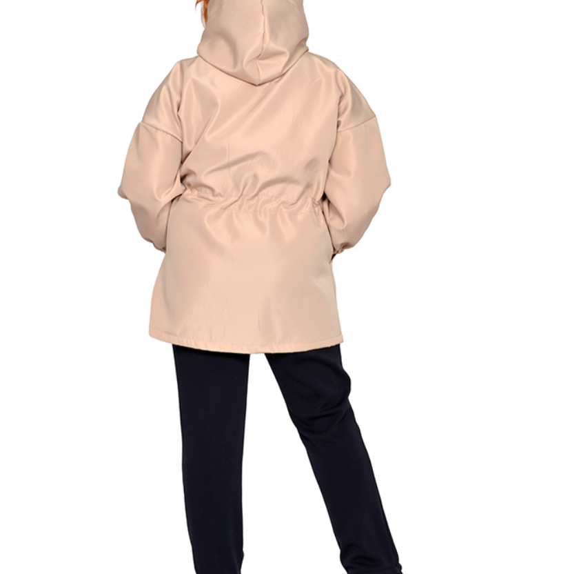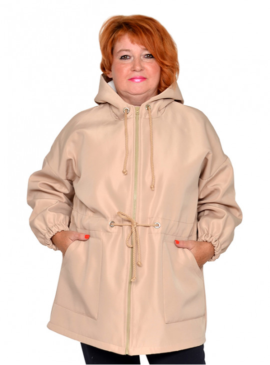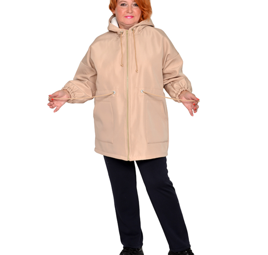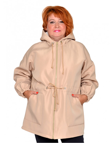 Куртка из плащевки на флисе. Состав 100% пэ. Ткань не мнется, мягкая. Сезон осень-весна. Модель с капюшоном, на молнии, с карманами, по поясу кулиска. Длина 80-95 см.
