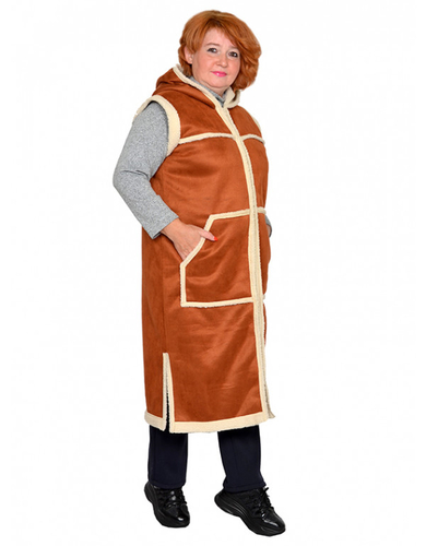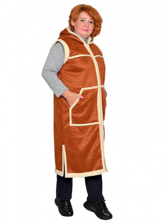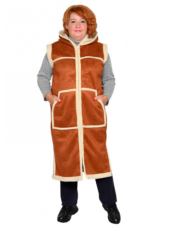 Жилет из искусственной двухсторонней замши, с карманами, с капюшоном, застежка молния. Состав пэ 95%, эластан 5%.Ткань тянется, не мнется, теплая, приятная к телу. Модель без подкладки, изнанка- барашек, лицевая сторона- искусственная замша. Длина 105-120 см.