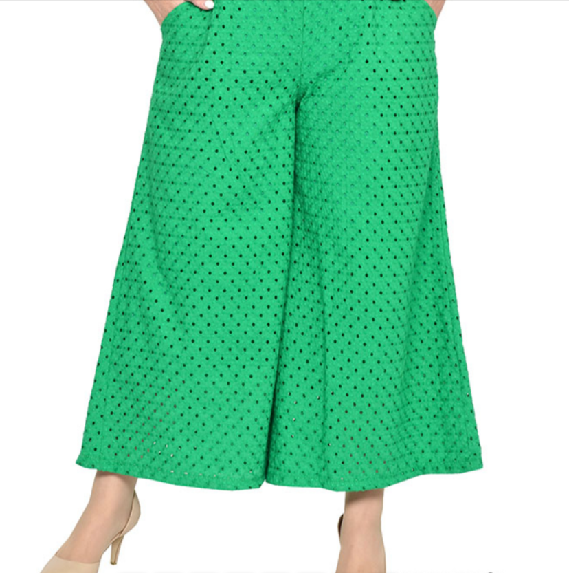 Брюки укороченные, расклешенные из ткани батист с шитьем. Состав ткани хлопок 100%. Брюки с подкладкой из хлопкового полотна, пояс на широкой резинке, модель с карманами.