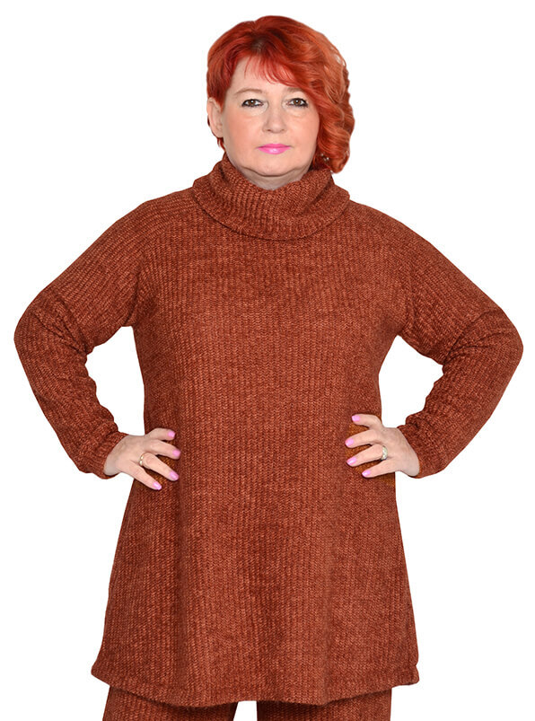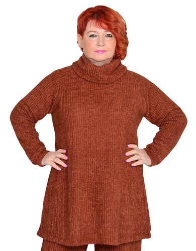 Свитер из трикотажного полотна «АНГОРА» с большим воротником, рукав реглан на манжете. Состав 95% полиакрил и 5% эластан. Ткань плотная, не мнется, хорошо тянется, мягкая, приятная на ощупь. Длина 80-90 см.