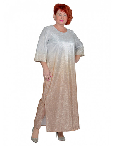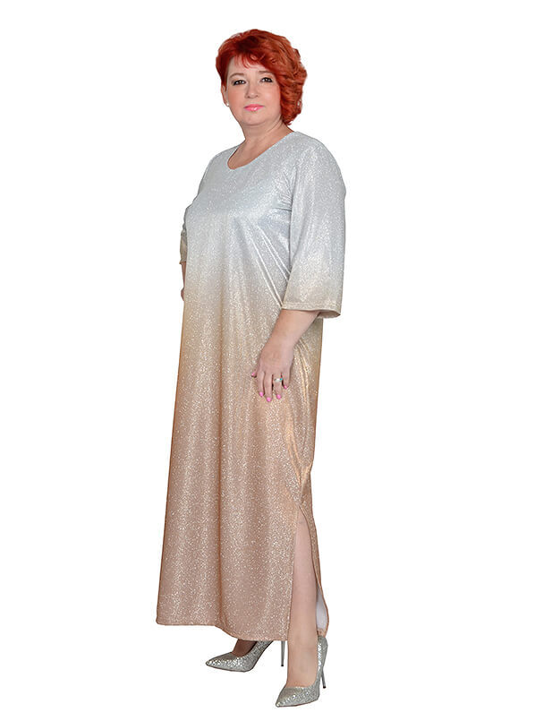 Платье из трикотажного полотна масло с напылением блеска с разрезами по бокам, длинное. Состав 95% пэ и 5% эластан. Ткань не мнется, хорошо тянется, мягкая, приятная на ощупь, не колется. При движении переливается.