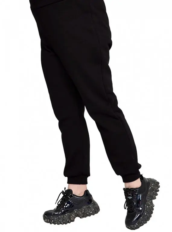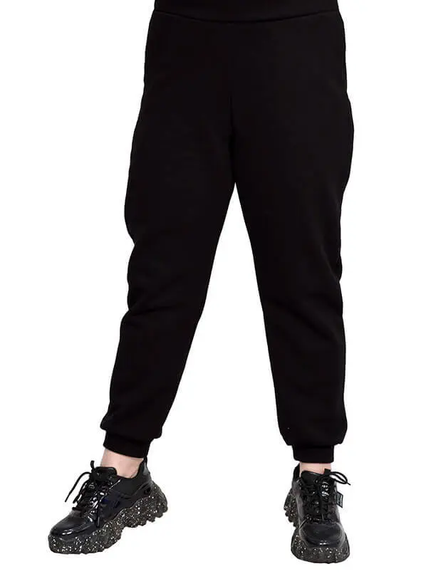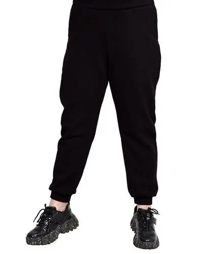 Брюки из ткани футер трехнитка начес. Пояс на широкой резинке, по низу манжет. Состав 35% пэ и 5% эластан, 65% хлопок.