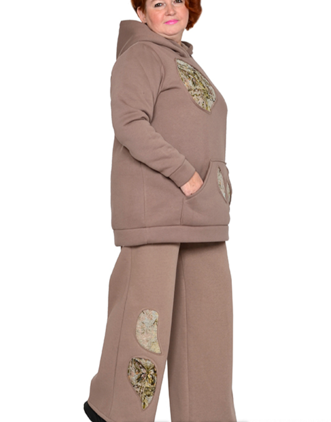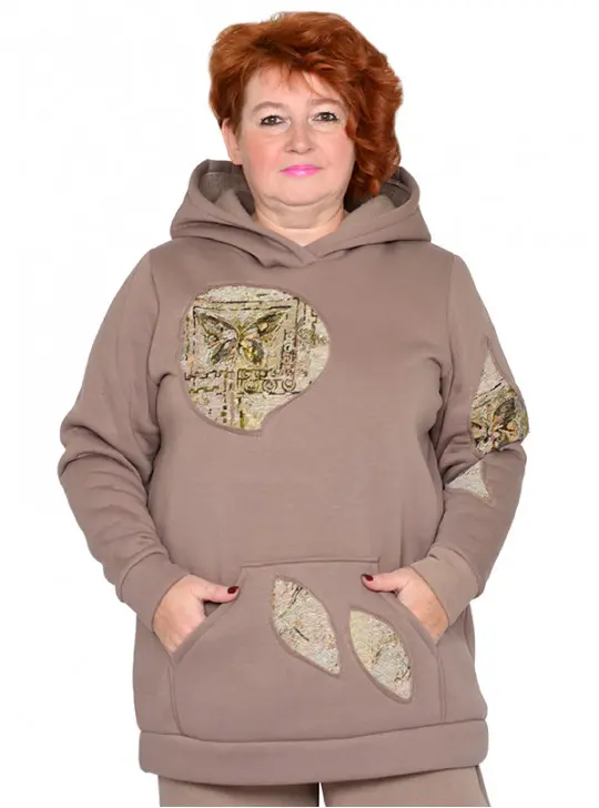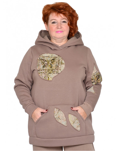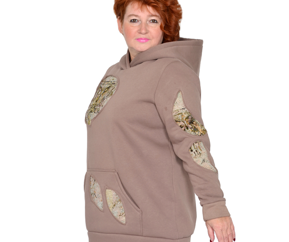 Толстовка из трикотажного полотна футер трехнитка с начесом. Аппликация из гобелена. Состав 35% пэ, 60% хлопок, 5% эластан. Лицевая сторона гладкая, изнанка с начесом.