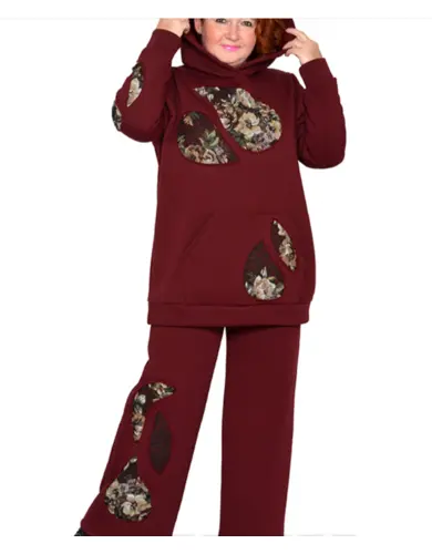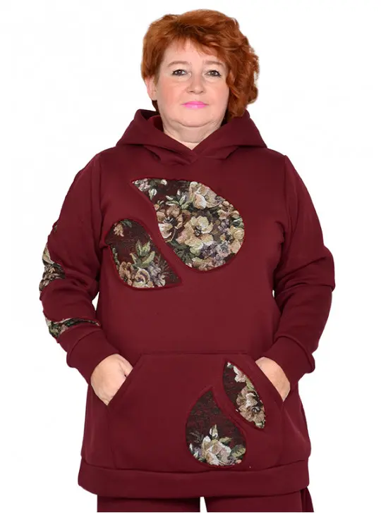 Толстовка из трикотажного полотна футер трехнитка с начесом. Аппликация из гобелена. Состав 35% пэ, 60% хлопок, 5% эластан. Лицевая сторона гладкая, изнанка с начесом.