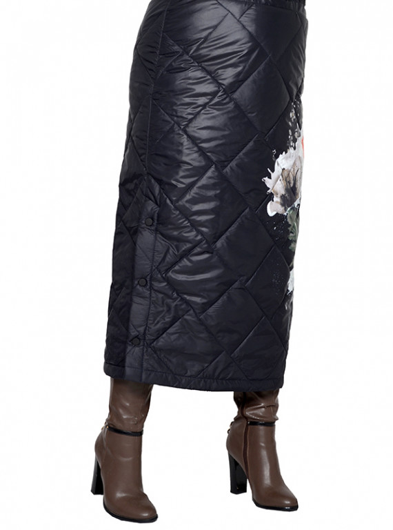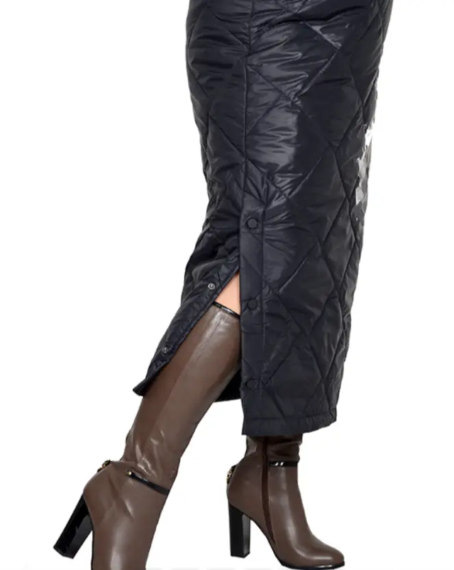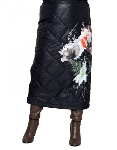 Юбка из плащевки стеганного на синтепоне. Внутренняя сторона также простегана подкладочной тканью. Состав 100% пэ. Ткань очень теплая, не мнется, приятная, мягкая и очень легкая, не тянется. Модель на поясе с резинкой, с боковой молнией, у пояса застежка кнопка, по одной боковой стороне разрез, который застегивается на кнопки.