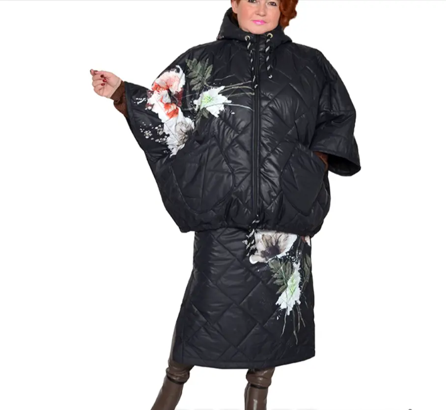 Куртка-пончо из плащевки стеганного на синтепоне. Внутренняя сторона также простегана подкладочной тканью. Состав 100% пэ. Ткань очень теплая, не мнется, приятная, мягкая и очень легкая, не тянется. Модель на молнии, с капюшоном, с карманами, по низу шнур. Сезон весна-осень.