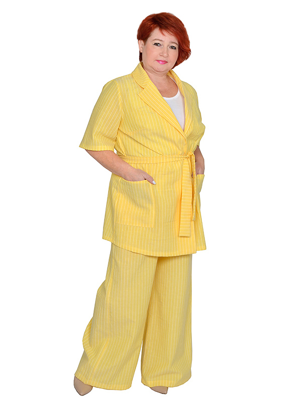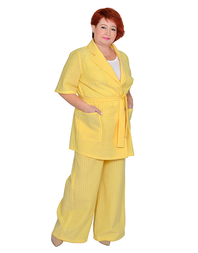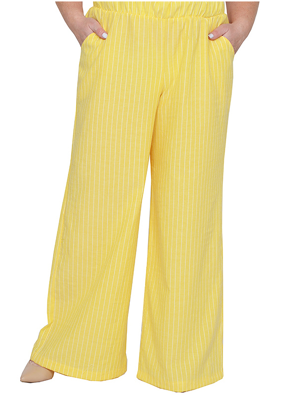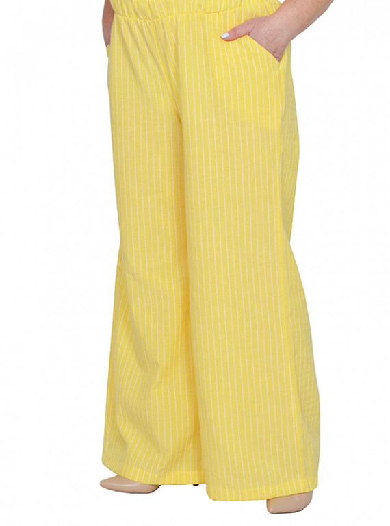 > Брюки-клеш с карманами, пояс на широкой резинке желтые в белую полоску 35% хлопок