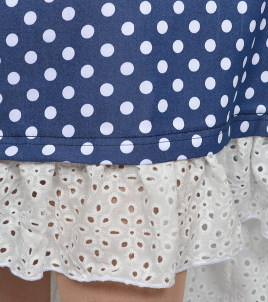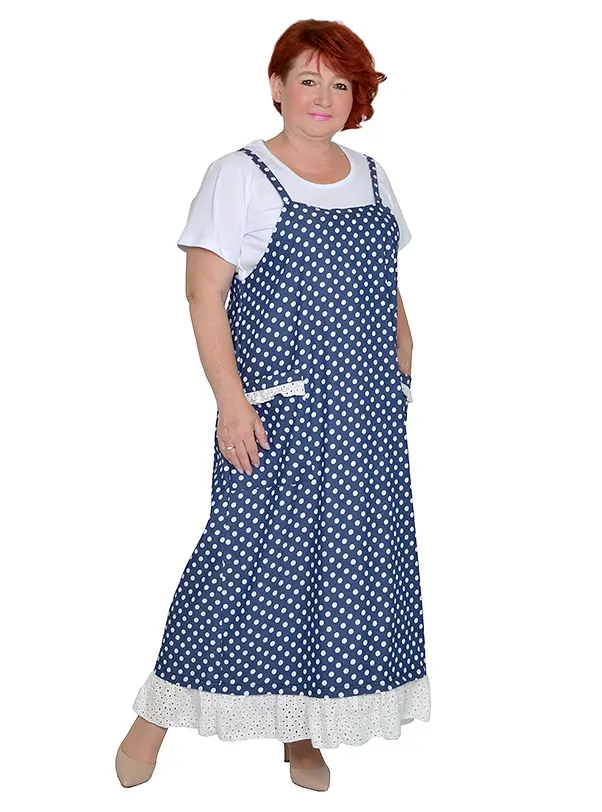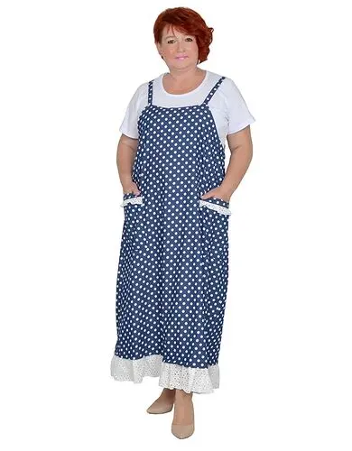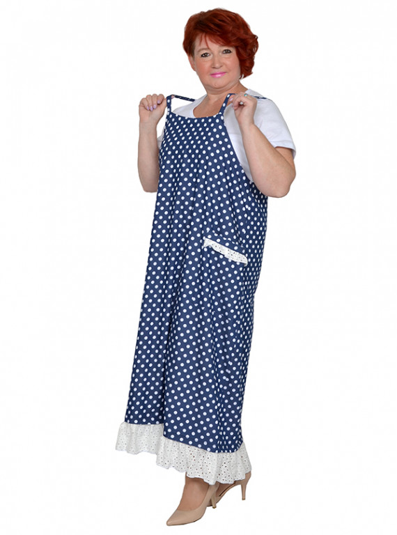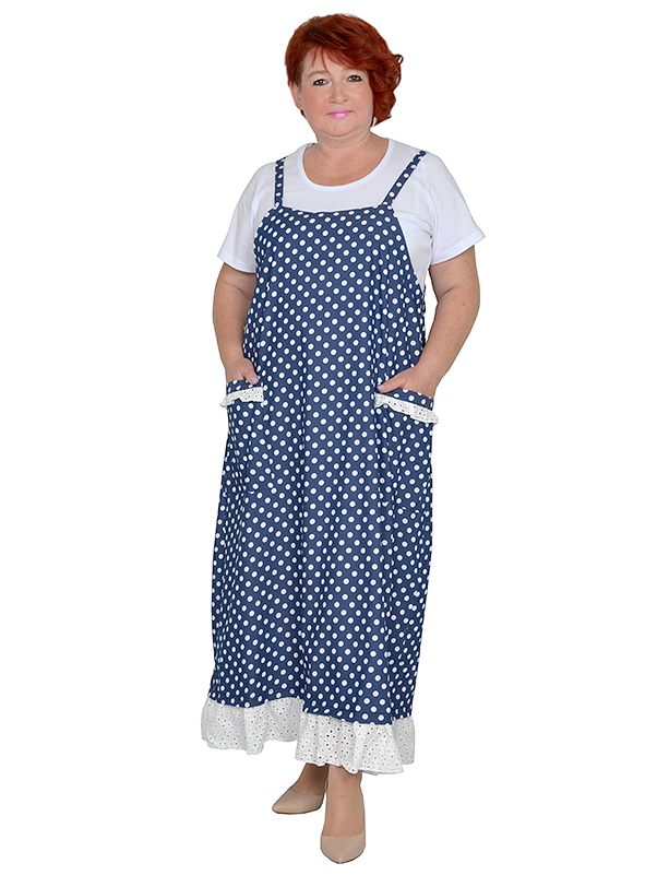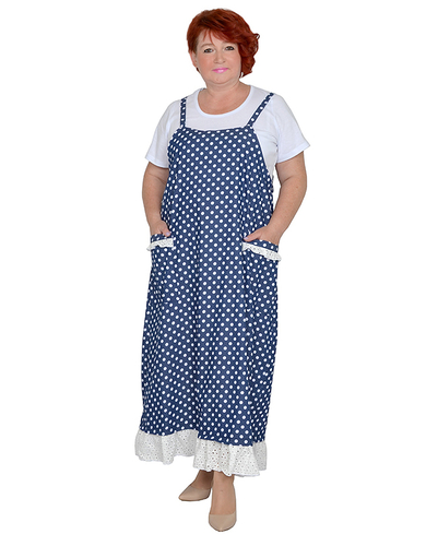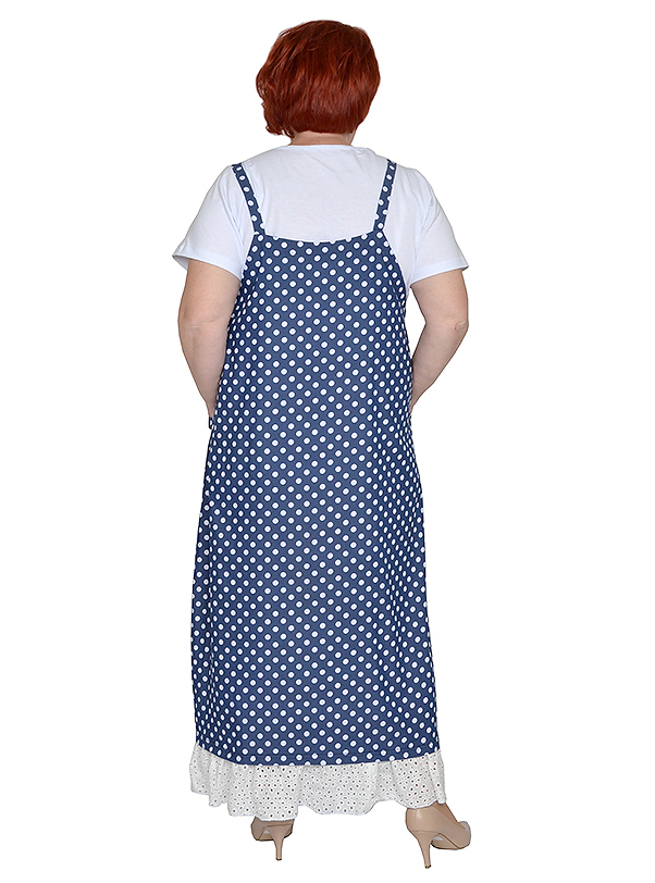Сарафан из облегченной ткани коттон под джинсу с отделкой по низу и карману батистом с шитьем и футболка из хлопка. Состав хлопок 35%, пэ 63% и 2% эластан.