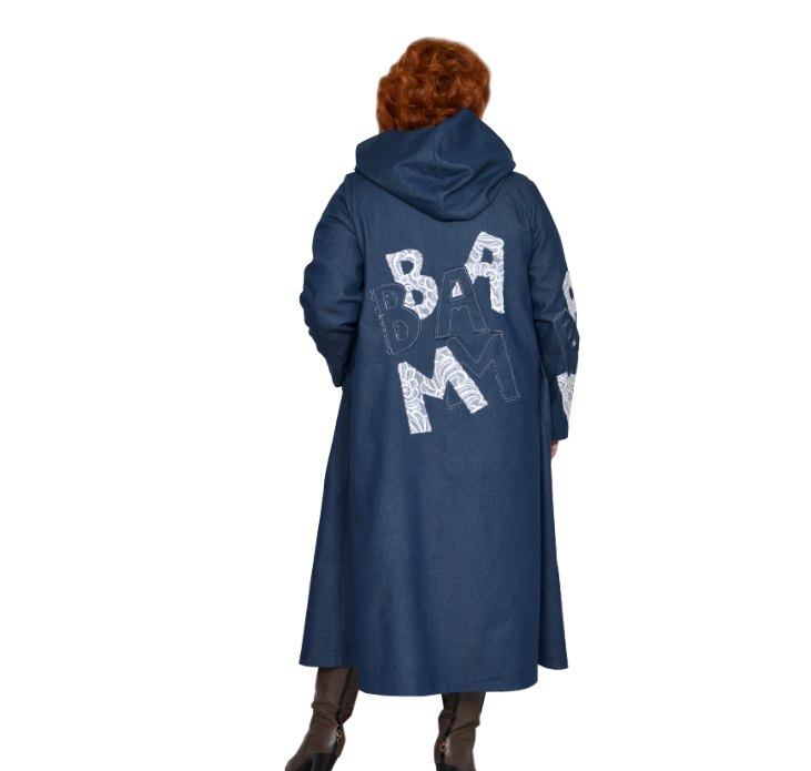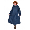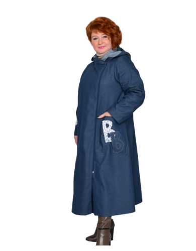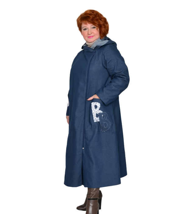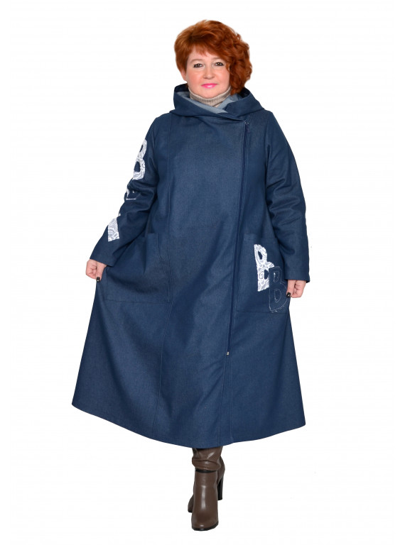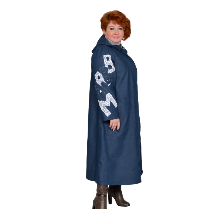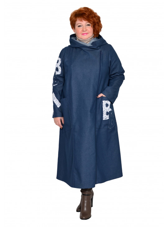 Плащ из джинсовой ткани. Состав 65% хлопок, 35% пэ. Ткань мало тянется. Модель с карманами, на карманах, рукаве и спинке декоративные элементы, выполненные из кружева. Модель расклешенная, на молнии, с капюшоном, без подкладки.