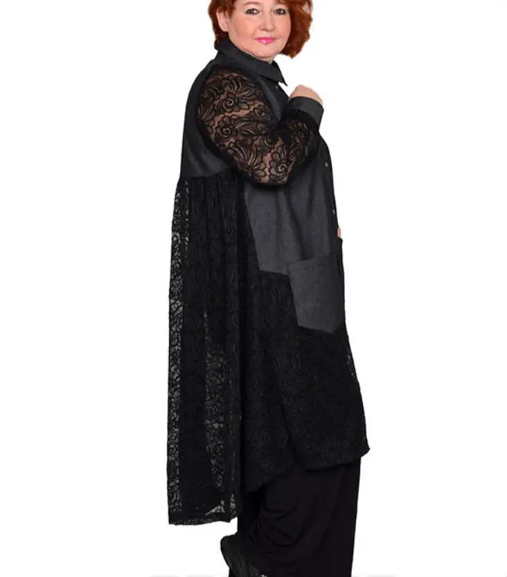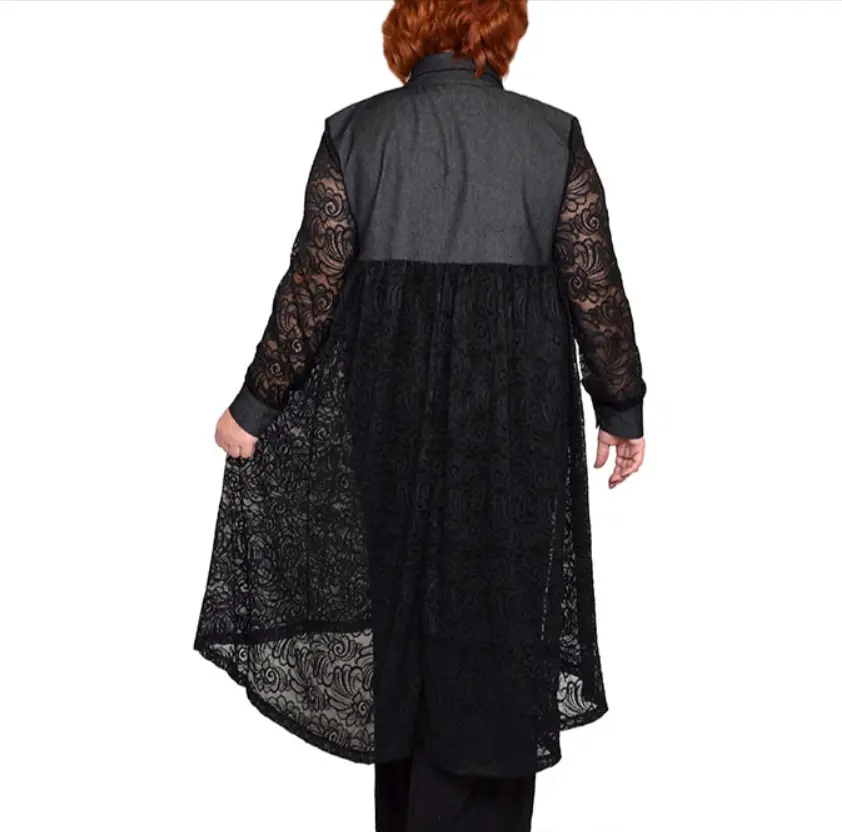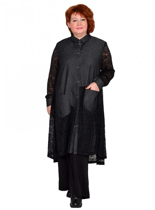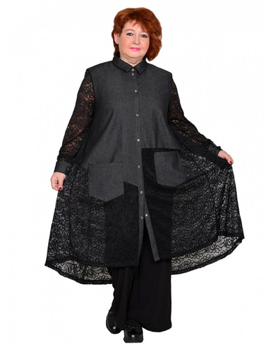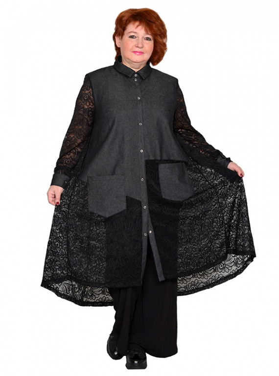 Рубашка из плетеного кружева и джинсовой ткани. Состав 60% хлопок, 35% пэ, 5% эластан. Модель с воротником, на кнопках, подол сзади расклешенный.