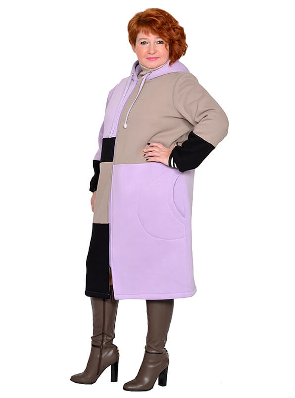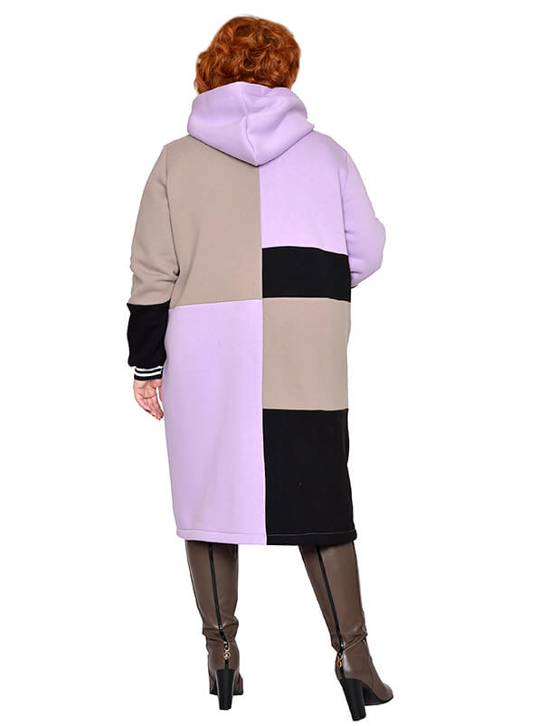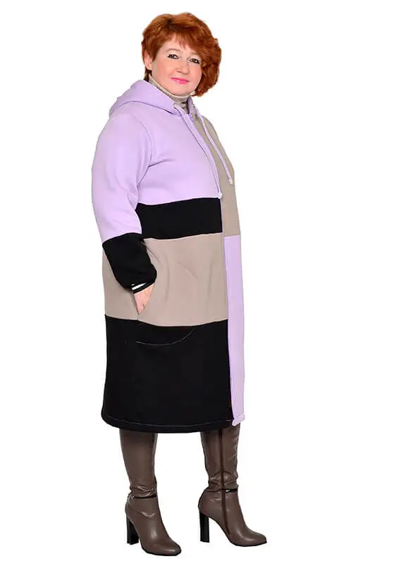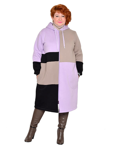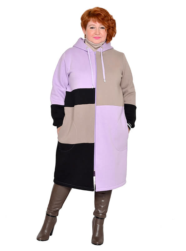 Толстовка удлиненная из трикотажного полотна футер трехнитка. Состав 35% пэ, 60% хлопок, 5% эластан. Лицевая сторона гладкая. изнанка с начесом. Ткань очень теплая. Сезон осень-зима. Модель выполнена из нескольких цветов, на молнии, с капюшоном, с карманами.