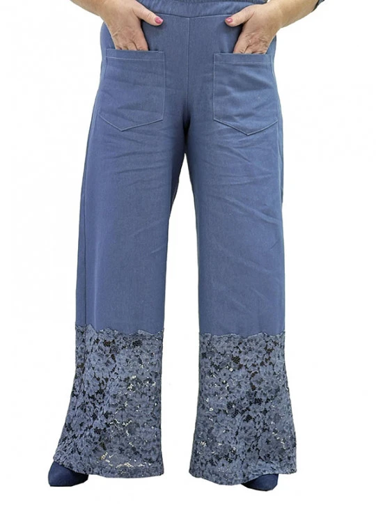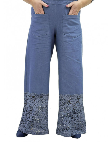 Брюки широкие с карманами из джинсовой и кружевной ткани. Состав джинсы 65% хлопок,35% пэ. Кружево хлопок 100%. Ткань не тянется, пояс на широкой резинке.