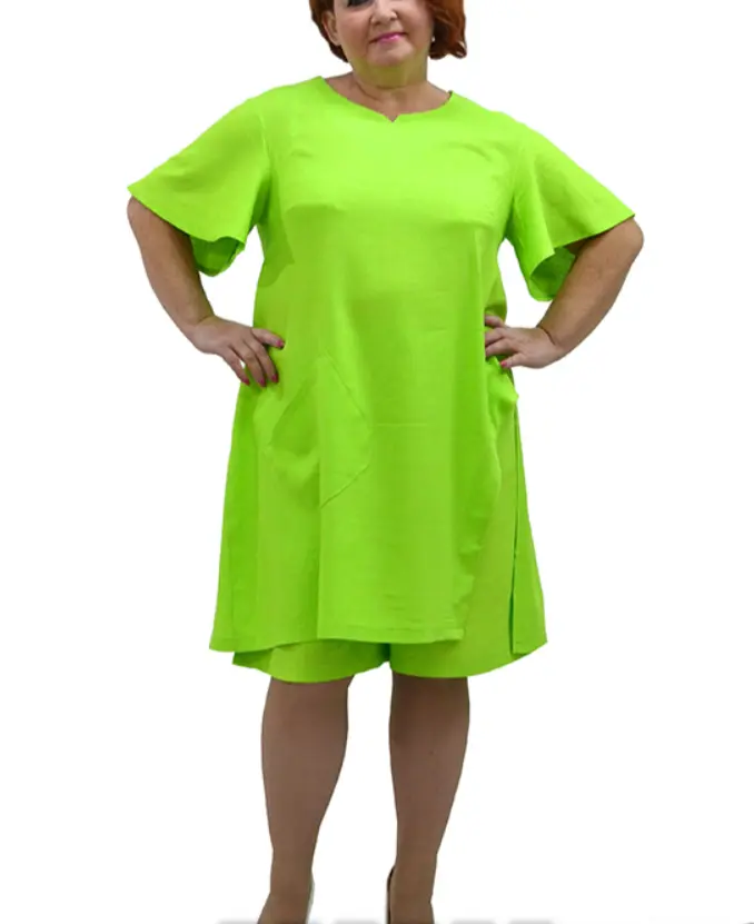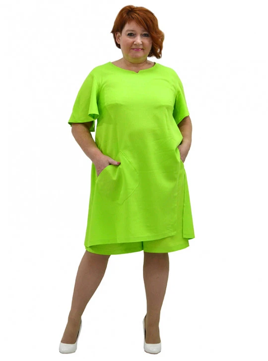 Платье-туника из льносодержащей ткани. Состав 85% вискоза, 15% лен. Модель с карманом,фигурный вырез по одному боку, рукав крыло. Ткань не тянется, очень легкая, приятная к телу. Длина 100-110 см.