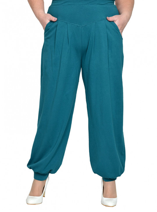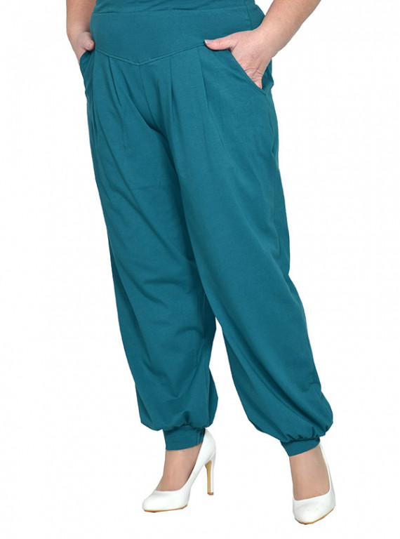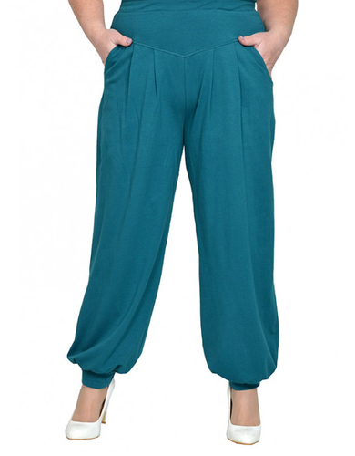 Брюки-султанки из вискозного трикотажного полотна. Состав 100% вискоза. Пояс на широкой резинке, с карманами, по переду кокетка, низ на манжете.