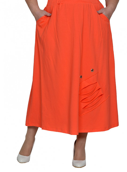 Юбка из вискозного трикотажного полотна. Состав 100% вискоза. Пояс на широкой резинке, с карманами, по переду декоративный элемент и люверсы.