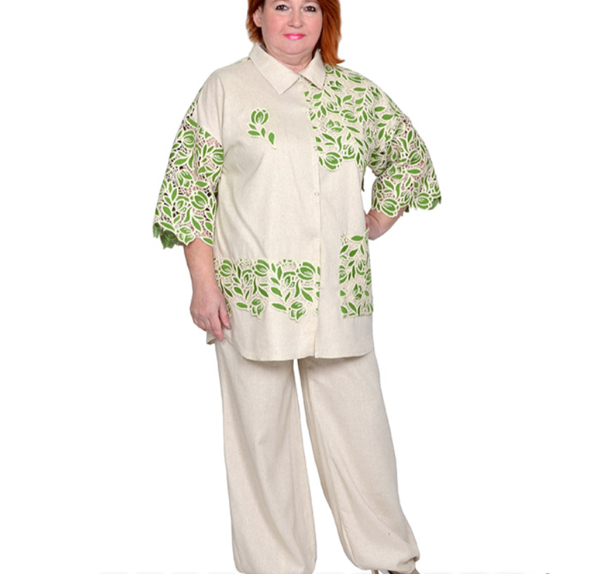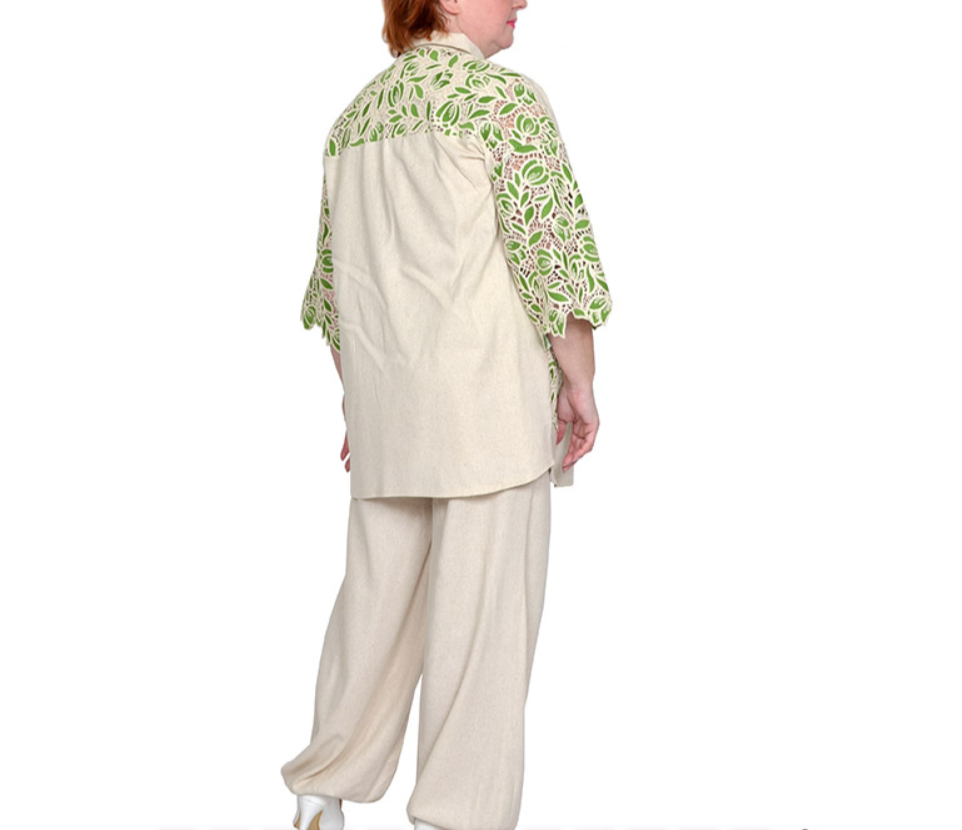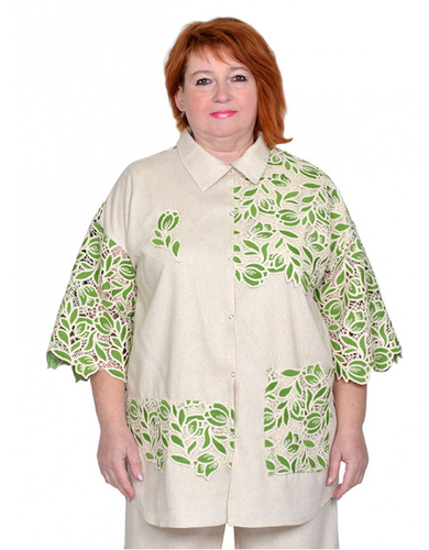 Рубашка из льносодержащей ткани с отделкой плетеным кружевом. Состав 85% вискоза,15% лен. Модель с воротником, застегивается на кнопки.