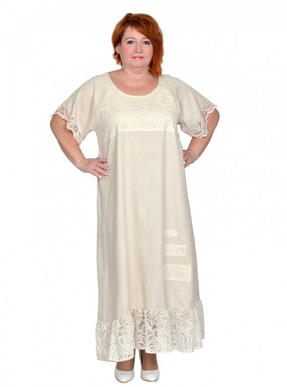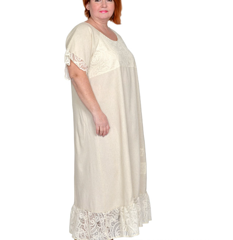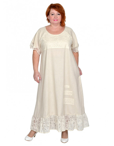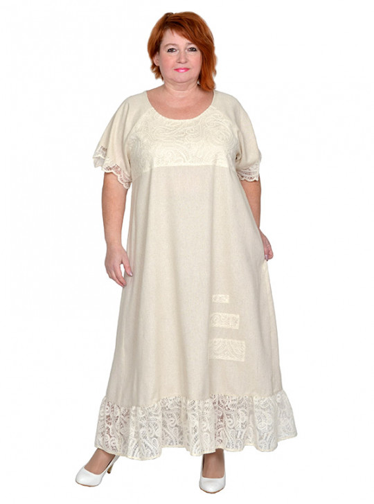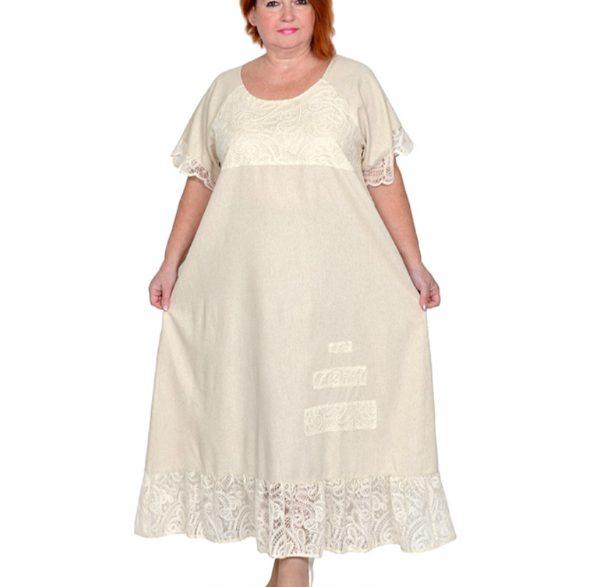Платье из льносодержащей ткани с отделкой плетеным кружевом. Состав 85% вискоза,15% лен. Модель расклешенная, с оборкой. Ткань легкая, не тянется, приятная к телу.