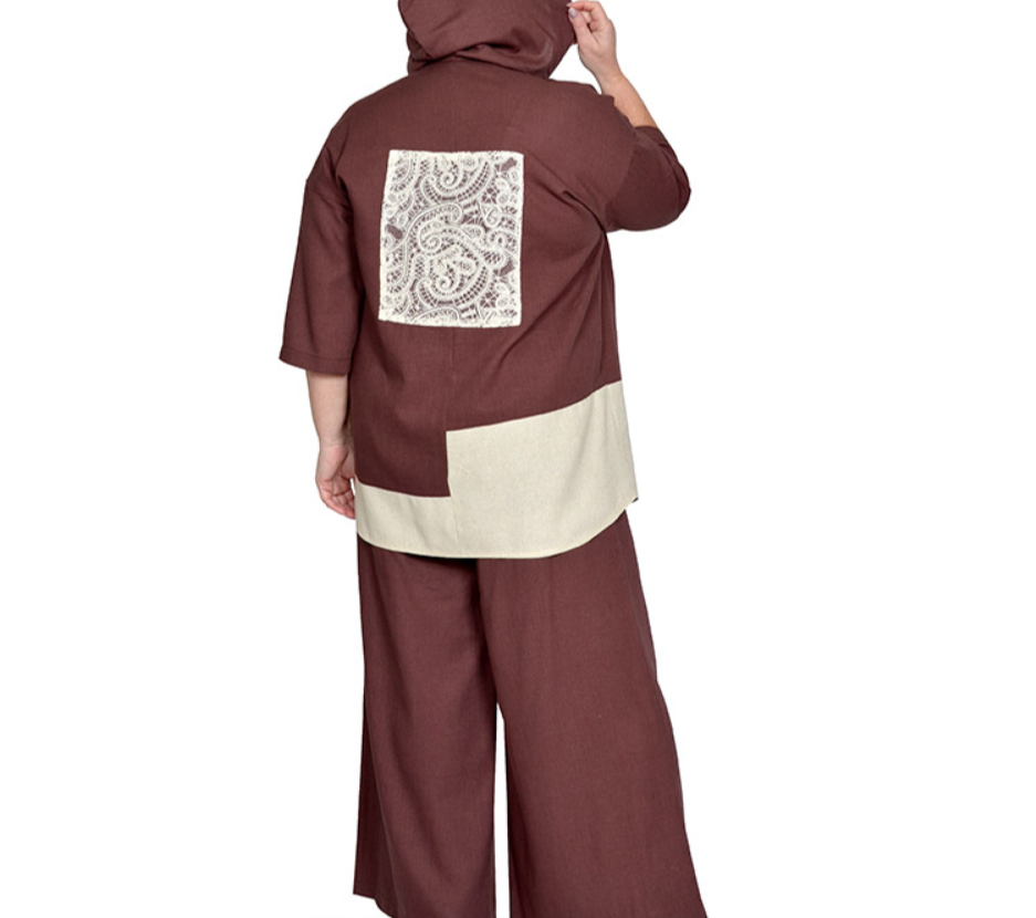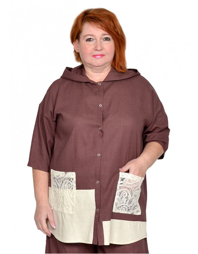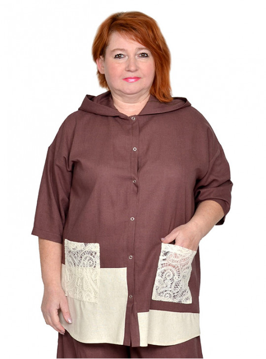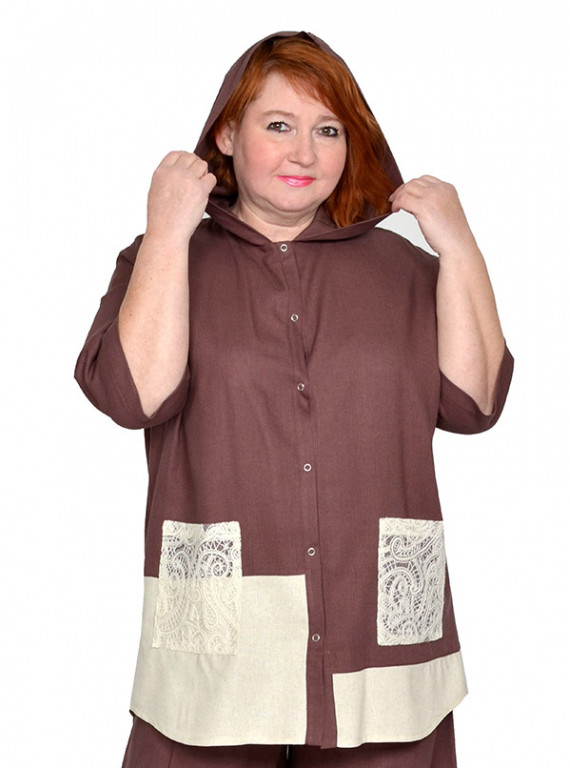 Рубашка из льносодержащей ткани с отделкой плетеным кружевом. Состав 85% вискоза,15% лен. Модель с капюшоном, застегивается на кнопки. Ткань легкая, не тянется, приятная к телу.